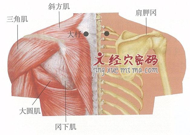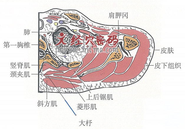 【穴位解剖】大杼穴下为皮肤、皮下组织、斜方肌、菱形肌、上后锯肌、骶棘肌。有肋间动、静脉后支的内侧支。皮肤有第七颈神经和分布着第一、二胸神经后支的内侧皮支,深层为外侧支。皮下筋膜致密,由脂肪及纤维束组成。纤维束连于斜方肌表面的背深筋膜与皮肤。副神经在斜方肌前缘中下1/3连接处深进该肌下面,与第三、四颈神经的分支形成神经丛,支配该肌。针经上列结构深进,可进第一肋间隙,或经横突间肌及其韧带,如盲目进针,经胸内筋膜,穿胸膜腔至肺,极易造成气胸。