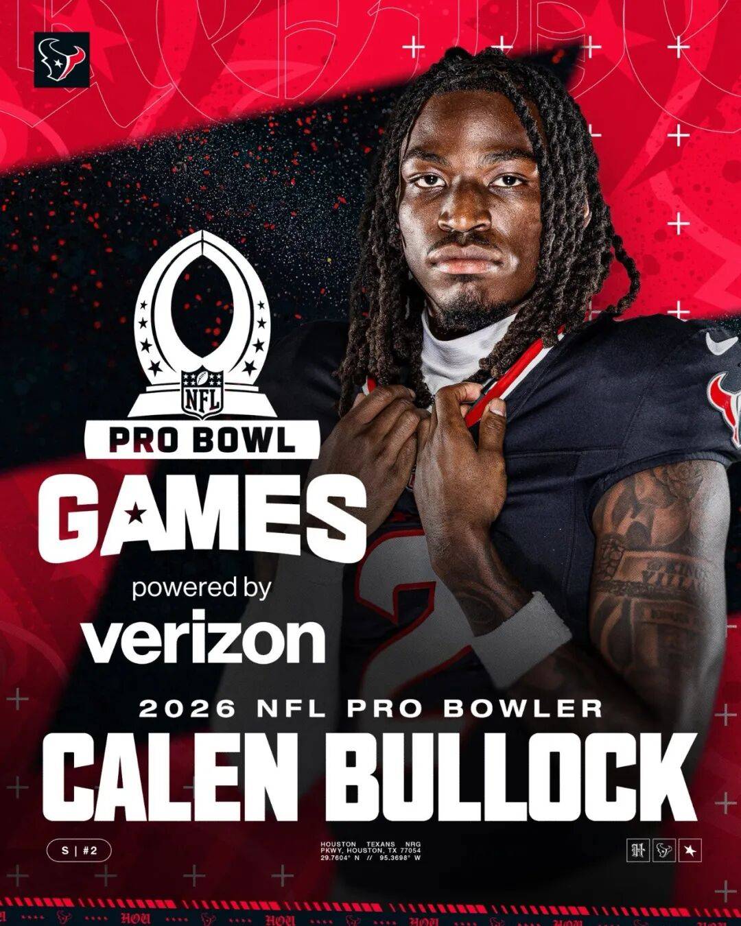 德州人的好消息还没结束,他们的安全卫卡伦-布洛克也被选入职业碗,顶替宣布退出的钢人安全卫杰伦-拉姆塞。这位来自南加大的二年级安全卫本赛季进步明显,首发了球队全部17场常规赛和2场季后赛,拿下生涯新高的64次擒抱,还在季后赛完成抄截回攻达阵。