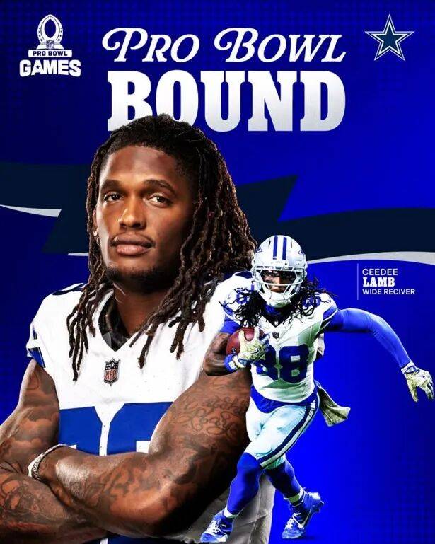 乔治-基特尔因伤缺席职业碗,牛仔近端锋杰克-弗格森宣布入替。本赛季联盟接球码王JSN需要备战超级碗,顶替他的依然是牛仔球员,外接手CD-兰姆。他在皮肯斯来到达拉斯后进攻火力不减,攻下1077码3达阵,这将是他连续第四年参与职业碗。