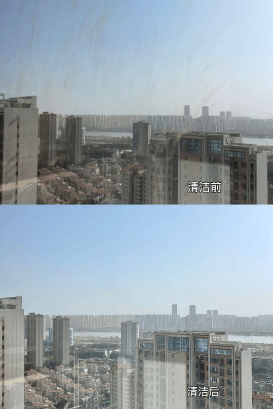 2. 清洁更净,透亮无痕迹:采用加压擦布+自动喷淋系统,不仅能轻松擦掉表面灰尘,还能瓦解长期积累的顽固污渍(比如雨水印、鸟粪、油污),擦后玻璃干净透亮,一点水渍、毛絮都没有,清洁效果比人工提升60%。